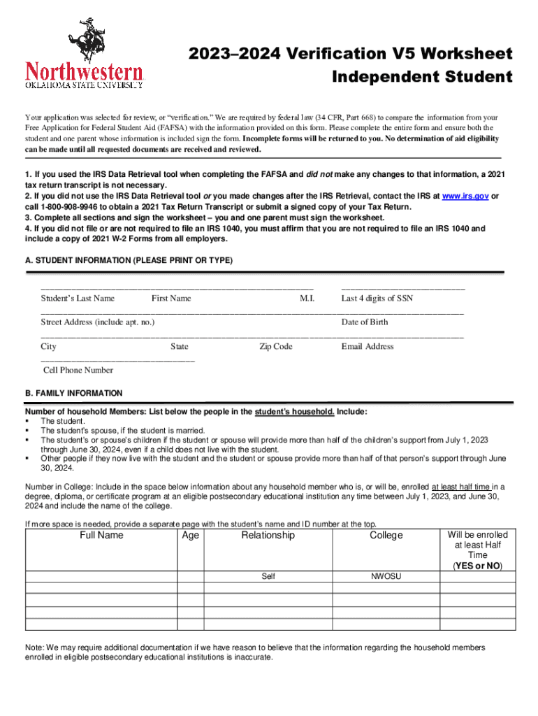 20232024 Verification V5 Worksheet Independent Student Your application was selected for review, or verification. We are required by federal law (34 CFR, Part 668) to compare the information from