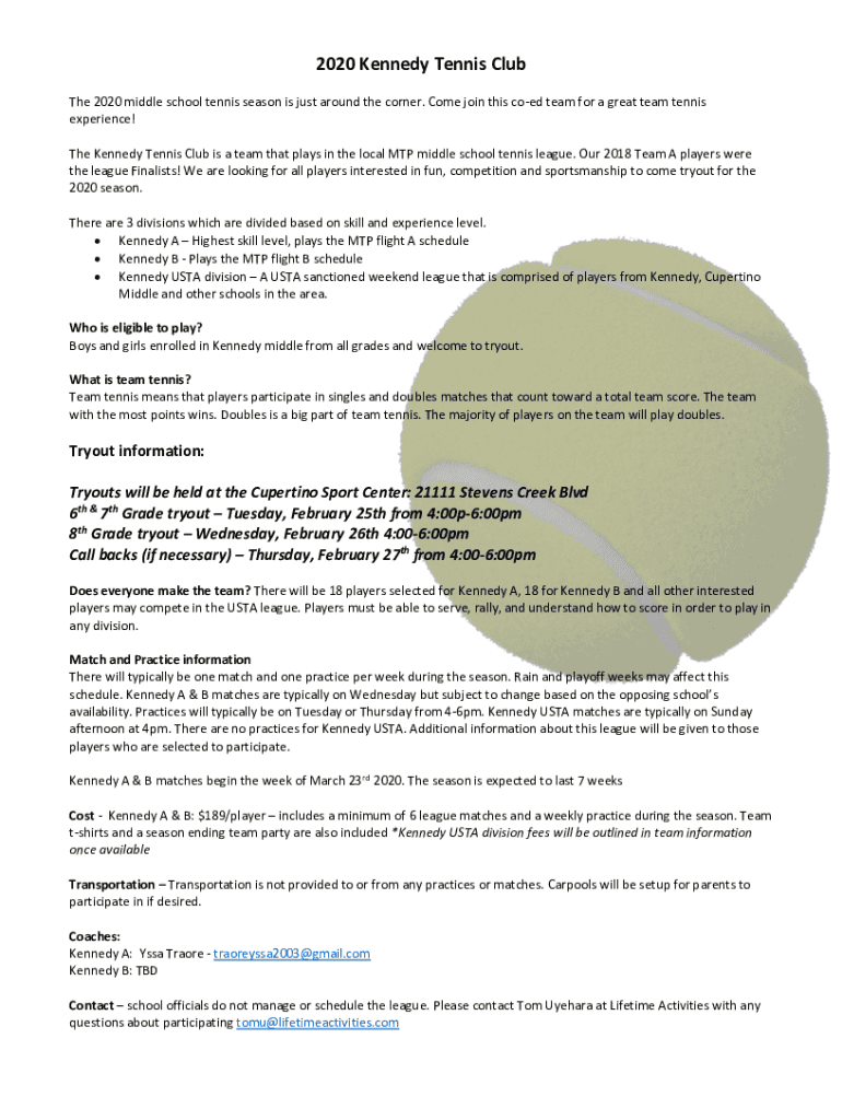 2020 Kennedy Tennis Club The 2020 middle school tennis season is just around the corner. Come join this coed team for a great team tennis experience! The Kennedy Tennis Club is a team that plays in