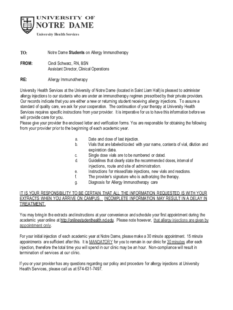 UNIVERSITY NOTE DAME University Health Services TO:Notre Dame Students on Allergy lmmunotherapyFROM:Hindi Schwarz, RN, BSN Assistant Director, Clinical Operations RE:Allergy lmmunotherapyUniversity