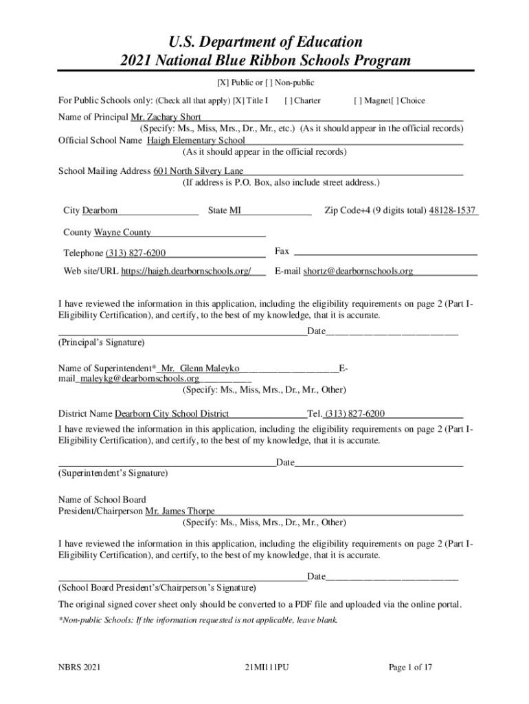 U.S. Department of Education 2021 National Blue Ribbon Schools Program [X] Public or [ ] Nonpublic Public Schools only: (Check all that apply) [X] Title I[ ] Charter[ ] Magnet[ ] ChoiceName of Principal