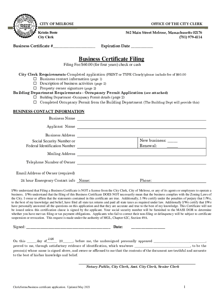 CITY OF MELROSEOFFICE OF THE CITY CLERK Kristin Foot City Clerk562 Main Street Melrose, Massachusetts 02176 (781) 9794114Business Certificate #___Expiration Date ___Business Certificate FilingFiling