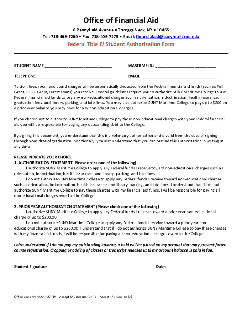 Office of Financial Aid 6 Penny field Avenue Throngs Neck, NY 10465 Tel: 7184097200 Fax: 7184097275 Email: financialaid@sunymaritime.eduFederal Title IV Student Authorization FormSTUDENT NAME ___MARITIME