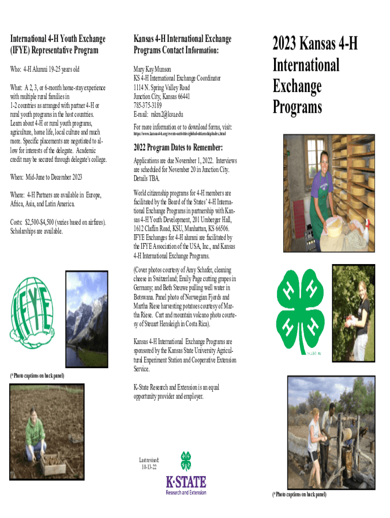 International 4H Youth Exchange (FYE) Representative Program Kansas 4H International Exchange Programs Contact Information:Who: 4H Alumni 1925 years old Mary Kay Manson KS 4H International Exchange