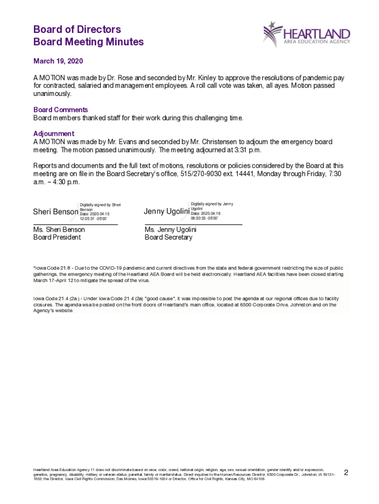 Board of Directors Board Meeting Minutes March 19, 2020, EMERGENCY BOARD MEETING* Ms. Sheri Benson, president, called the emergency meeting of the Heartland AEA Board of Directors to order at 3:01