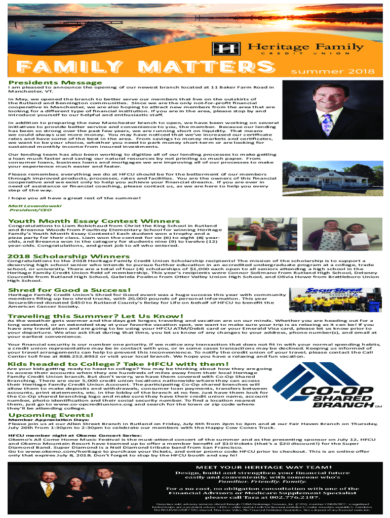 Summer 2018 Presidents Message am pleased to announce the opening of our newest branch located at 11 Baker Farm Road in Manchester, VT. In May, we opened the branch to better serve our members that