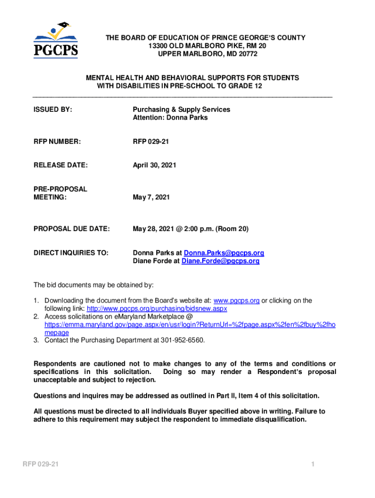 THE BOARD OF EDUCATION OF PRINCE GEORGES COUNTY 13300 OLD MARLBORO PIKE, RM 20 UPPER MARLBORO, MD 20772MENTAL HEALTH AND BEHAVIORAL SUPPORTS FOR STUDENTS WITH DISABILITIES IN PRESCHOOL TO GRADE 12