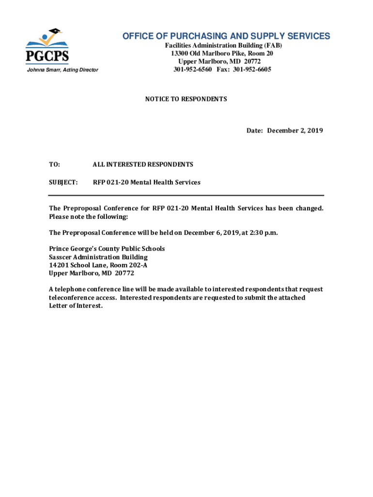 OFFICE OF PURCHASING AND SUPPLY SERVICES Facilities Administration Building (FAB) 13300 Old Marlboro Pike, Room 20 Upper Marlboro, MD 20772 3019526560 Fax: 3019526605Johnna Smart, Acting DirectorNOTICE