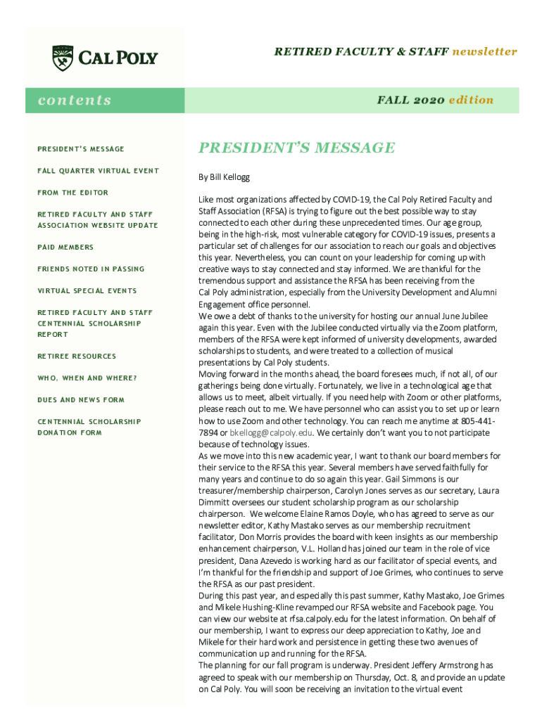 RETIRED FACULTY & STAFF newslettercontentsPRESIDENTS MESSAGE FALL QUARTER VIRTUAL EVENT FROM THE EDITOR RETIRED FACULTY AND STAFF ASSOCIATION WEBSITE UPDATE PAID MEMBERS FRIENDS NOTED IN PASSING VIRTUAL
