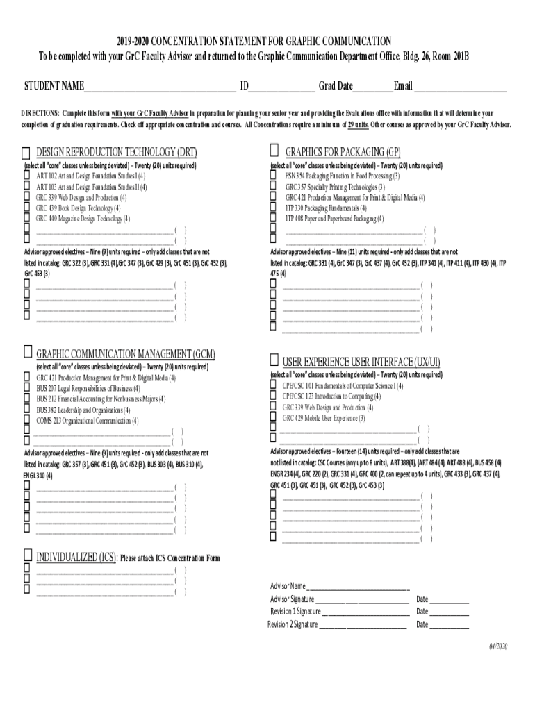 20192020 CONCENTRATION STATEMENT FOR GRAPHIC COMMUNICATION To be completed with your GRC Faculty Advisor and returned to the Graphic Communication Department Office, Bldg. 26, Room 201B STUDENT NAME___