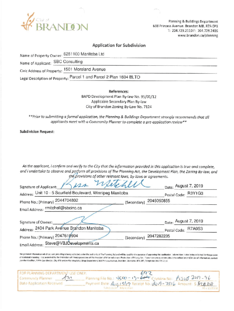 August 22, 2019BY EMAILProject No: 1717700Mr. Andrew OK, BES, RPP, MCP Senior Planner City of Brandon 638 Princess Avenue Brandon, MB R7A 0P3 Re: Letter of Intent for Zoning & Subdivision for Northridge
