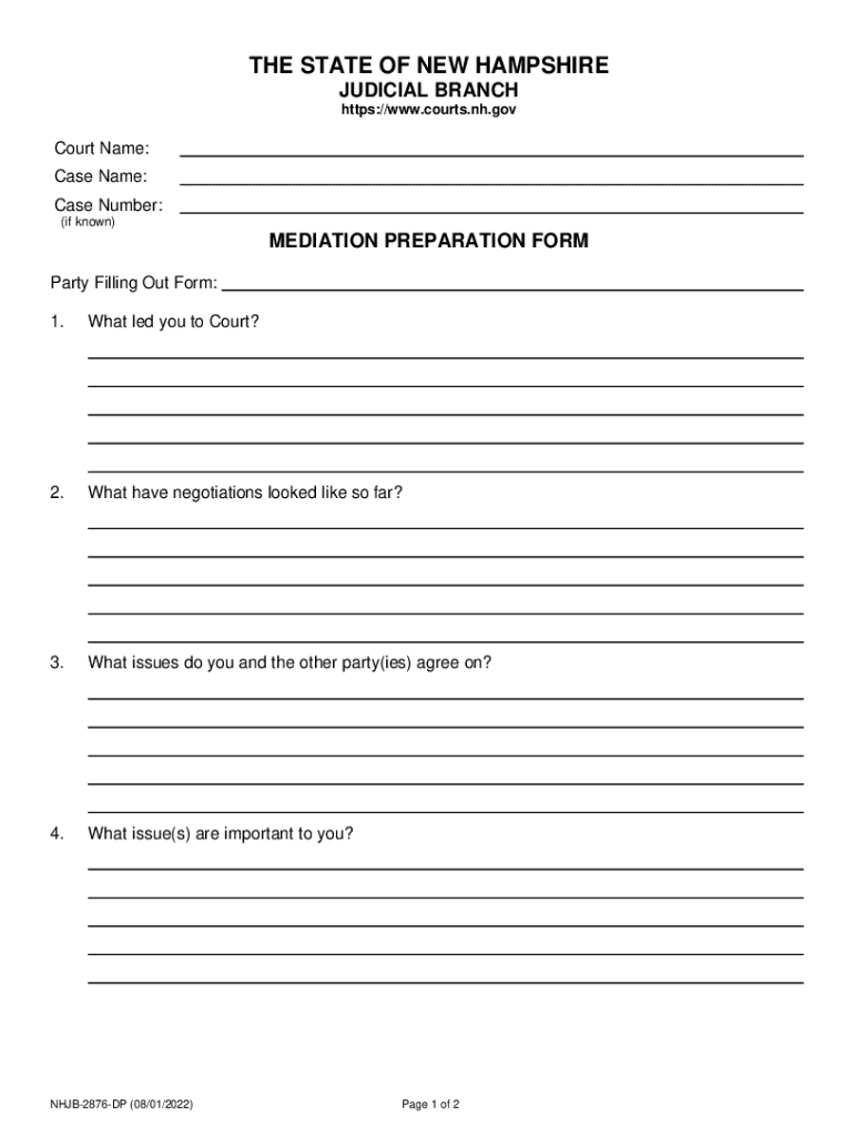 Clear Forth STATE OF NEW HAMPSHIRE JUDICIAL BRANCH https://www.courts.nh.govCourt Name: Case Name: Case Number: (if known)MEDIATION PREPARATION FORM Party Filling Out Form: 1. What led you to Court?2.