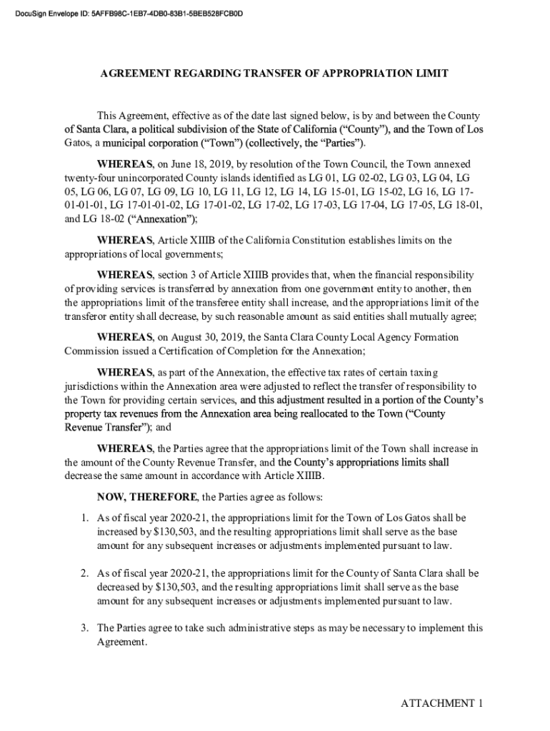 AGREEMENT REGARDING TRANSFER OF APPROPRIATION Limits Agreement, effective as of the date last signed below, is by and between the County Gates, a.WHEREAS, on June 18, 2019, by resolution of the Town