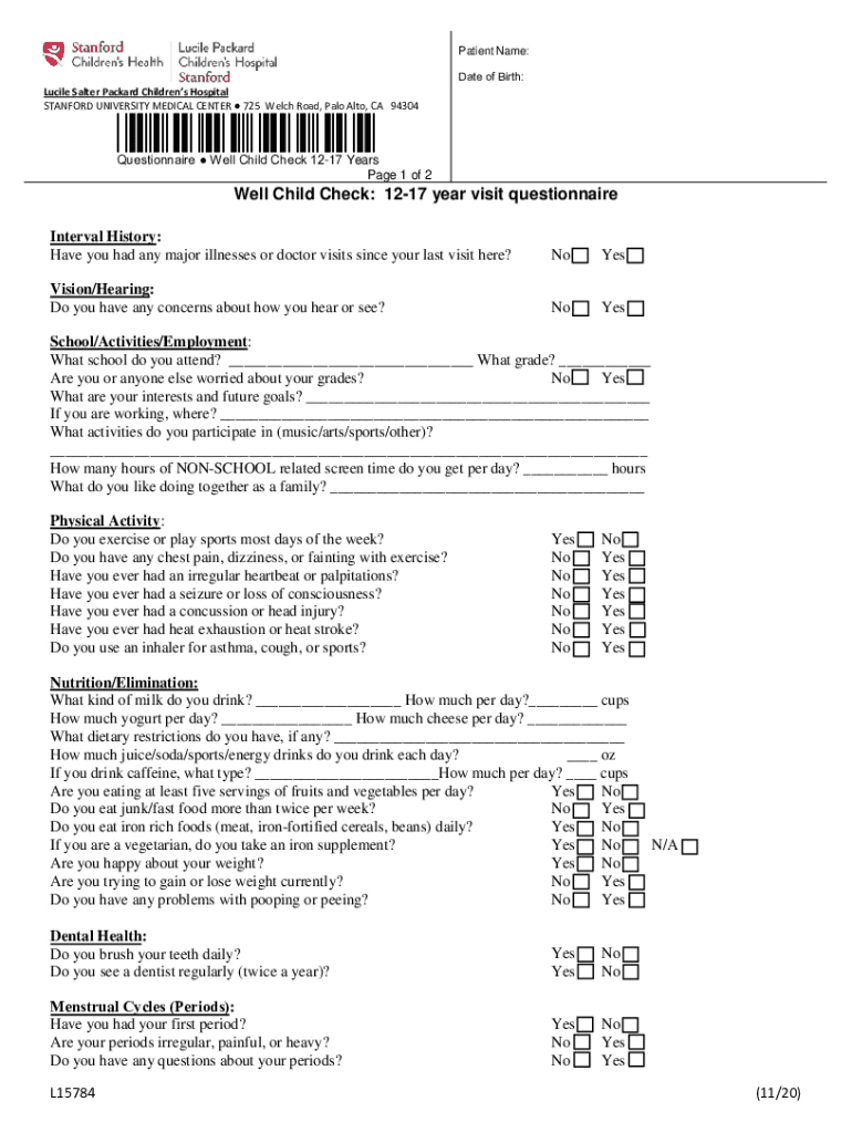 Patient Name: Lucile Salter Packard Children's Hospital STANFORD UNIVERSITY MEDICAL CENTER 725 Welch Road, Palo Alto, CA 94304Date of Birth:*L15784×Questionnaire Well Child Check 1217 Years Page