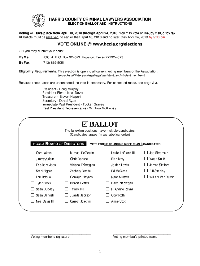 HARRIS COUNTY CRIMINAL LAWYERS ASSOCIATION ELECTION BALLOT AND INSTRUCTIONS Voting will take place from April 10, 2018, through April 24, 2018. You may vote online, by mail, or by fax. All ballots
