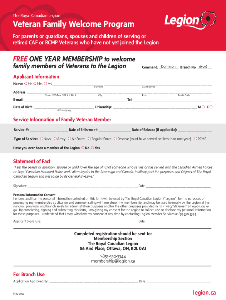 The Royal Canadian LegionVeteran Family Welcome Program For parents or guardians, spouses and children of serving or retired CAF or RCMP Veterans who have not yet joined the Legionaries ONE YEAR MEMBERSHIP