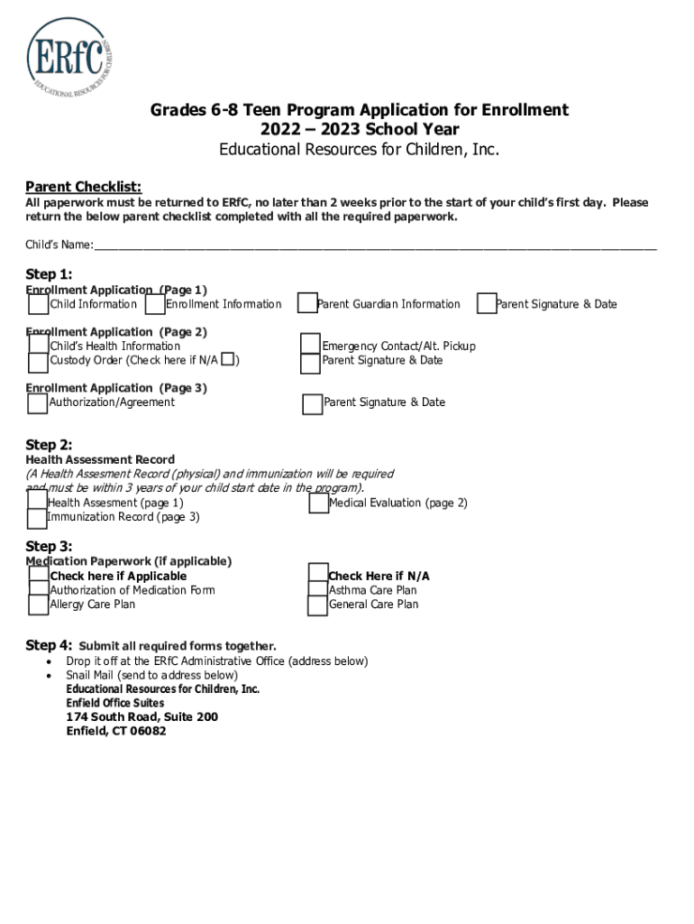 Grades 68 Teen Program Application for Enrollment 2022 2023 School Year Educational Resources for Children, Inc. Parent Checklist: All paperwork must be returned to Eric, no later than 2 weeks prior