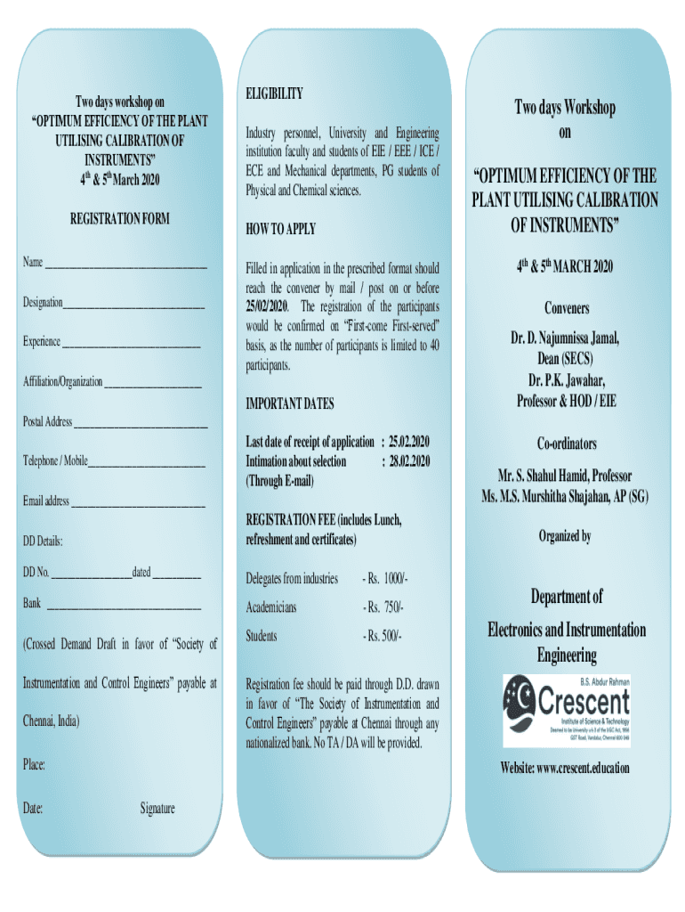 Two days workshop on OPTIMUM EFFICIENCY OF THE PLANT Utilizing CALIBRATION OF INSTRUMENTS 4th & 5th March 2020 REGISTRATION FORM Name ___ Designation___ Experience ___ELIGIBILITY Industry personnel,