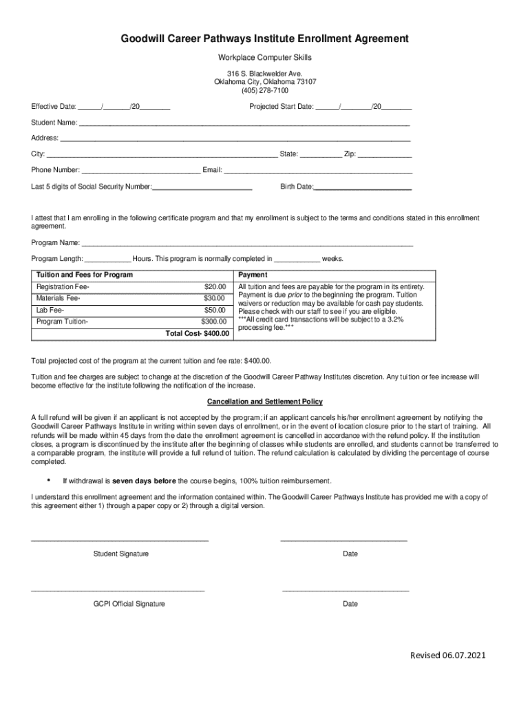 Goodwill Career Pathways Institute Enrollment Agreement Workplace Computer Skills 316 S. Black welder Ave. Oklahoma City, Oklahoma 73107 (405) 2787100 Effective Date: ___/___/20___Projected Start
