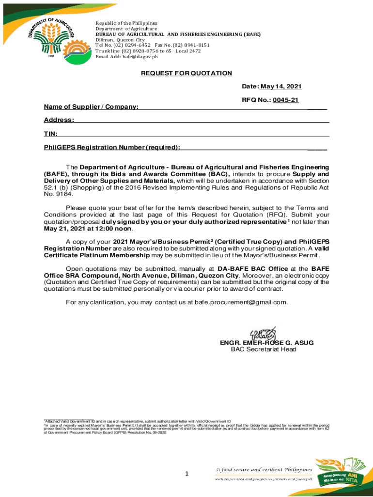 Get the free REQUEST FOR QUOTATION Date: May 14, 2021 RFQ No ...