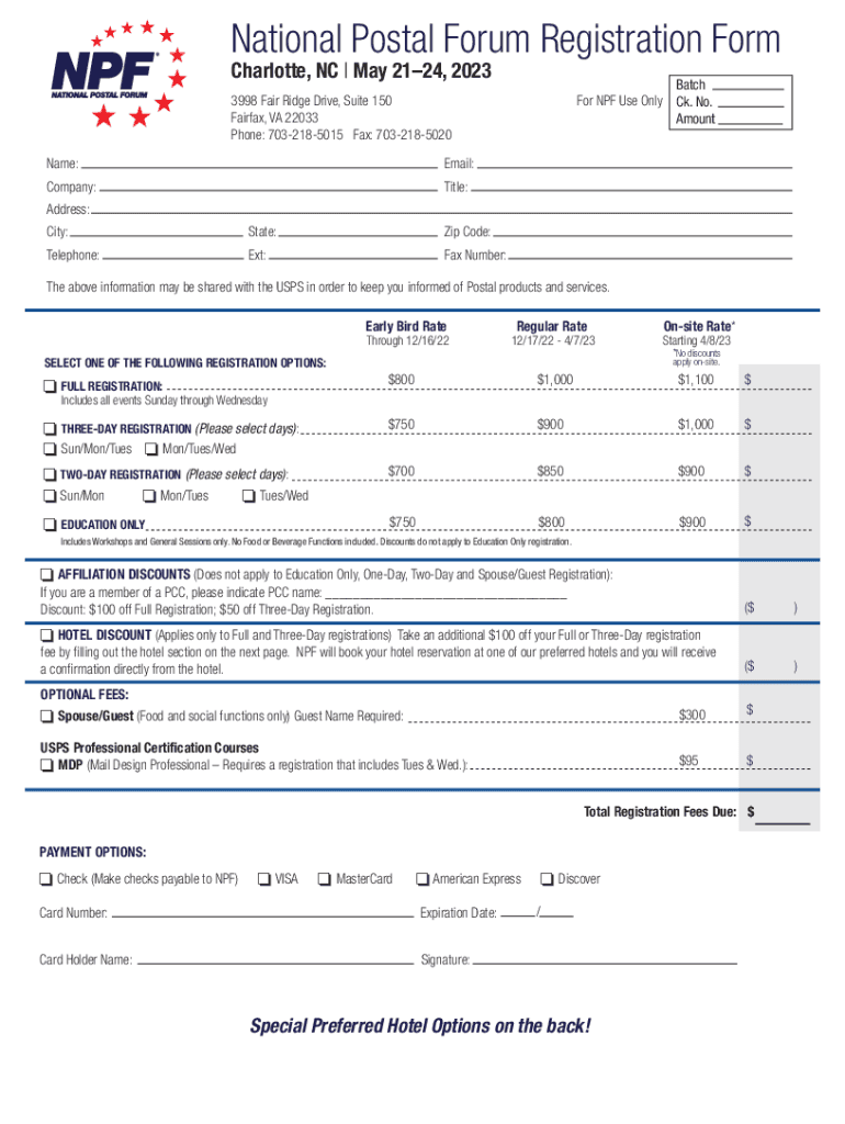 National Postal Forum Registration Form Charlotte, NC | May 2124, 2023 3998 Fair Ridge Drive, Suite 150 Fairfax, VA 22033 Phone: 7032185015 Fax: 7032185020For NPF Use Unlatch Ck. No. AmountName:_Email: