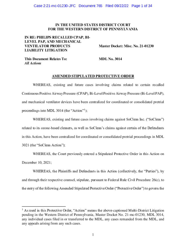Case 2:21mc01230JFC Document 765 Filed 09/22/22-Page 1 of 34IN THE UNITED STATES DISTRICT COURT FOR THE WESTERN DISTRICT OF PENNSYLVANIA IN RE: PHILIPS RECALLED CPAP, LEVEL PAP, AND MECHANICAL VENTILATOR