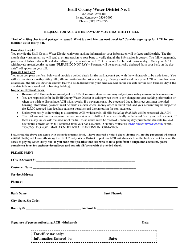 Still County Water District No. 1 76 Cedar Grove Rd. Irvine, Kentucky 403367607 Phone: (606) 7233795REQUEST FOR ACH WITHDRAWAL OF MONTHLY UTILITY BILL Tired of writing checks and postage increases?