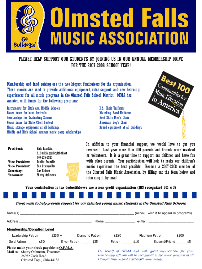 PLEASE HELP SUPPORT OUR STUDENTS BY JOINING US IN OUR ANNUAL MEMBERSHIP DRIVE FOR THE 20072008 SCHOOL YEAR! Membership and fund-raising are the two biggest fundraisers for the organization. These