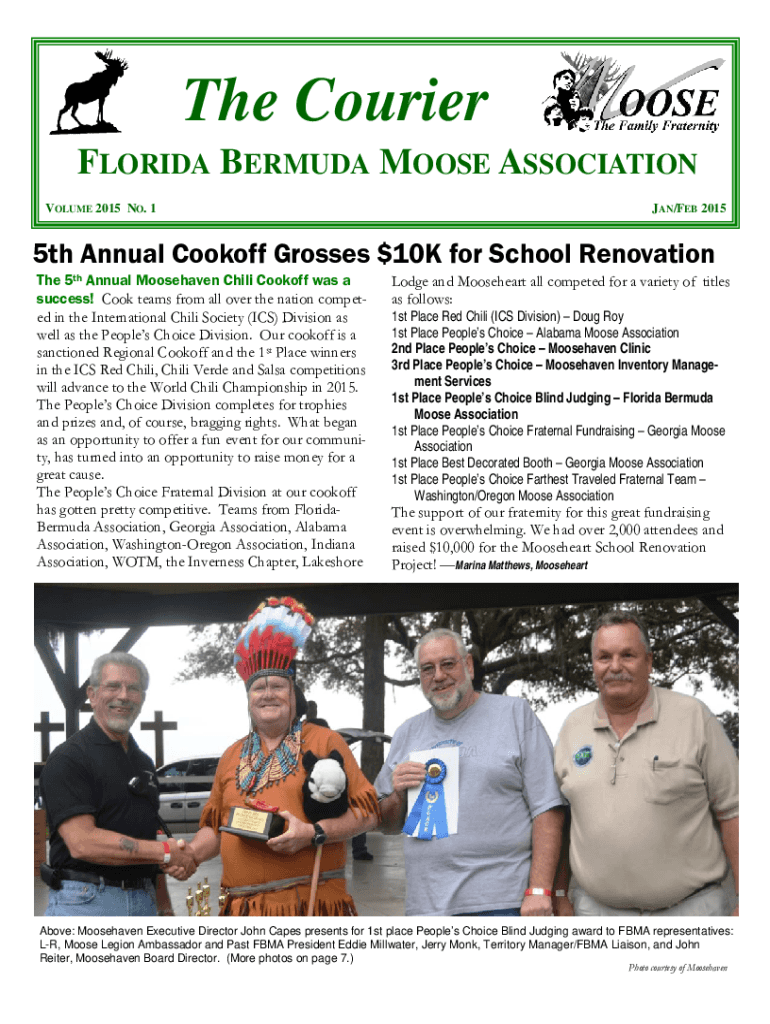 The Courier FLORIDA BERMUDA MOOSE ASSOCIATION VOLUME 2015 NO. 1JAN/FEB 20155th Annual Cook off Grosses $10K for School Renovation The 5th Annual Moose haven Chili Cook off was a success! Cook teams