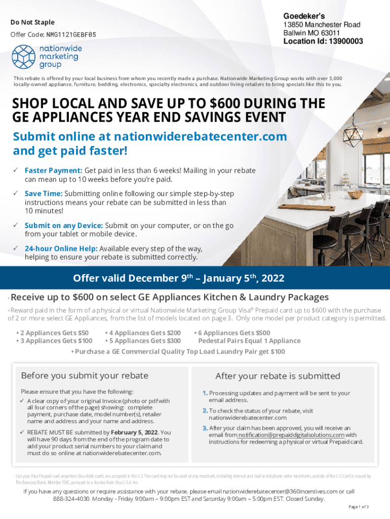 Baedeker\'SDO Not Staple13850 Manchester Road Baldwin MO 63011Oer Code: NMG1121GEBF05Location I'd: 13900003This rebate is offered by your local business from whom you recently made a purchase. Nationwide