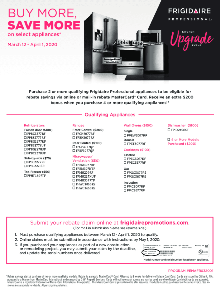 BUY MORE, SAVE MOREUpgrade KITCHEN on select appliances* March 12 April 1, 2020EVENTPurchase 2 or more qualifying Frigidaire Professional appliances to be eligible for rebate savings via online or