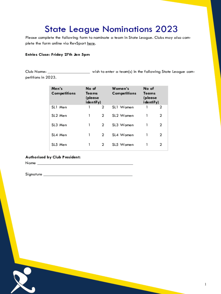 State League Nominations 2023 Please complete the following form to nominate a team in State League. Clubs may also complete the form online via Rev Sport here. Entries Close: Friday 27th Jan 5pmClub