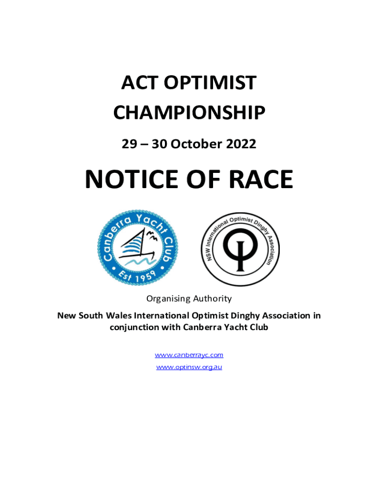 ACT OPTIMIST CHAMPIONSHIP 29 30 October 2022NOTICE OF Reorganizing Authority New South Wales International Optimist Dinghy Association in conjunction with Canberra Yacht Club www.canberrayc.com www.optinsw.org.auNSW