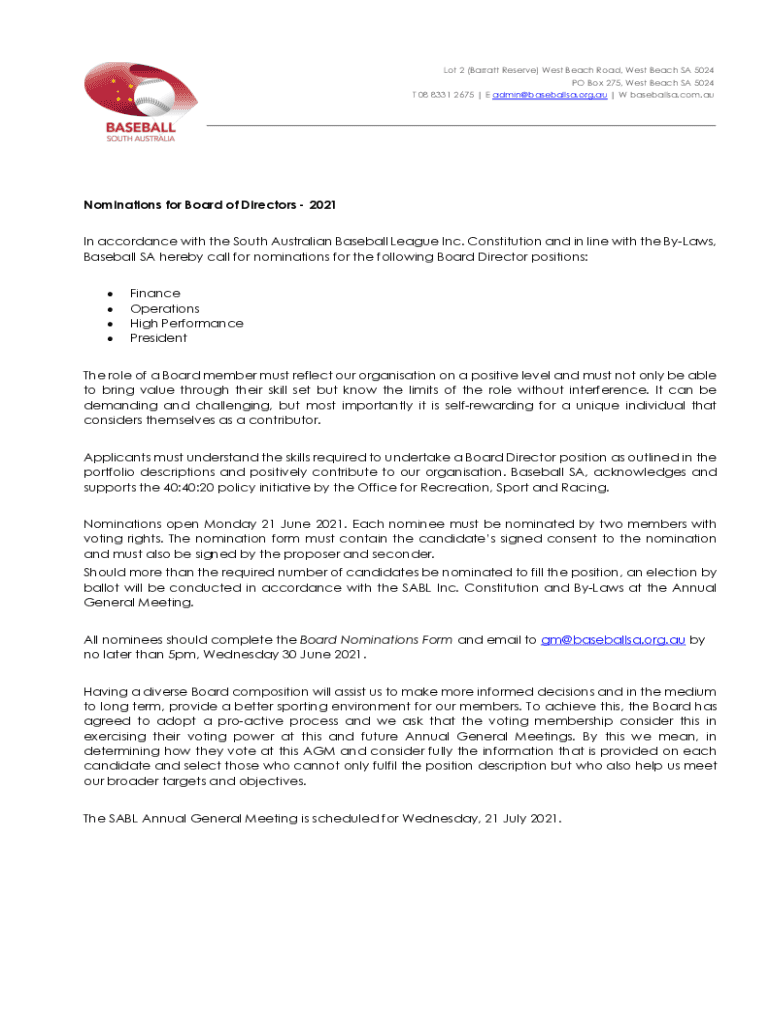 Lot 2 (Barrett Reserve) West Beach Road, West Beach SA 5024 PO Box 275, West Beach SA 5024 T 08 8331 2675 | E admin@baseballsa.org.au | W baseballsa.com.denominations for Board of Directors 2021 In