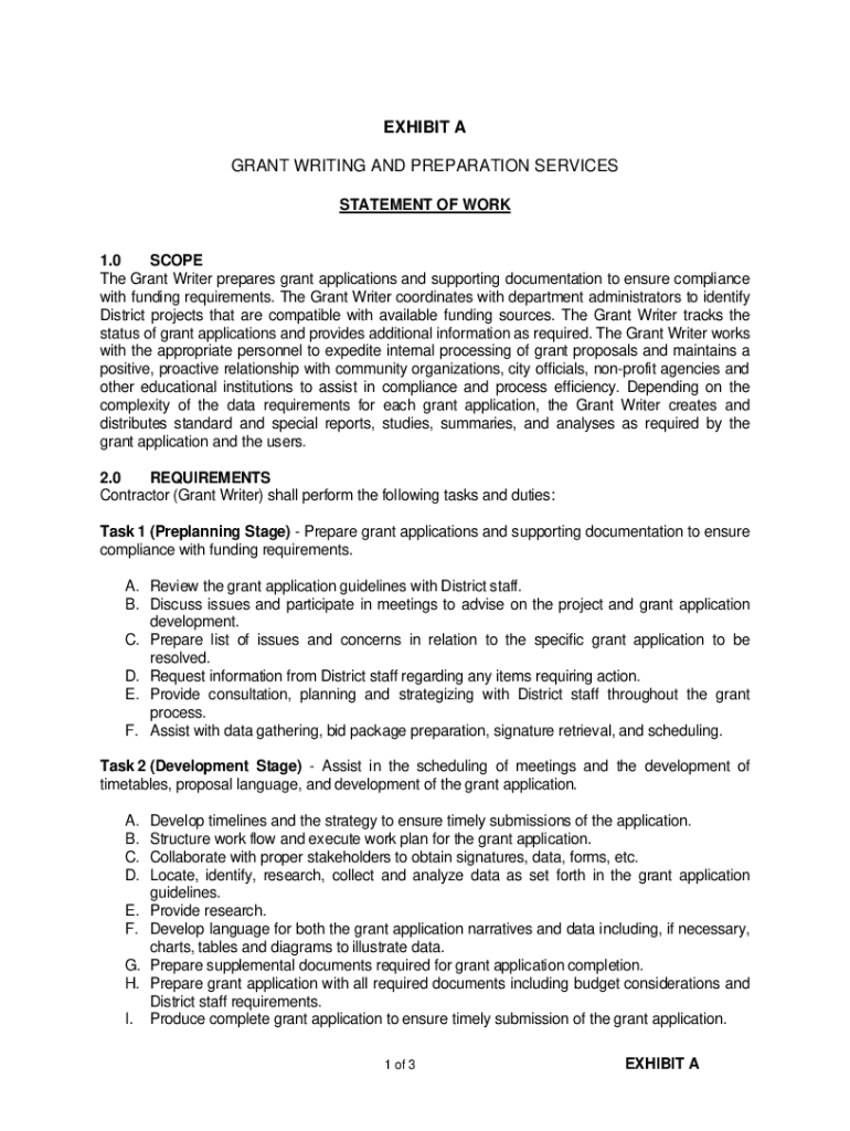 EXHIBIT A GRANT WRITING AND PREPARATION SERVICES STATEMENT OF WORK1.0 SCOPE The Grant Writer prepares grant applications and supporting documentation to ensure compliance with funding requirements.