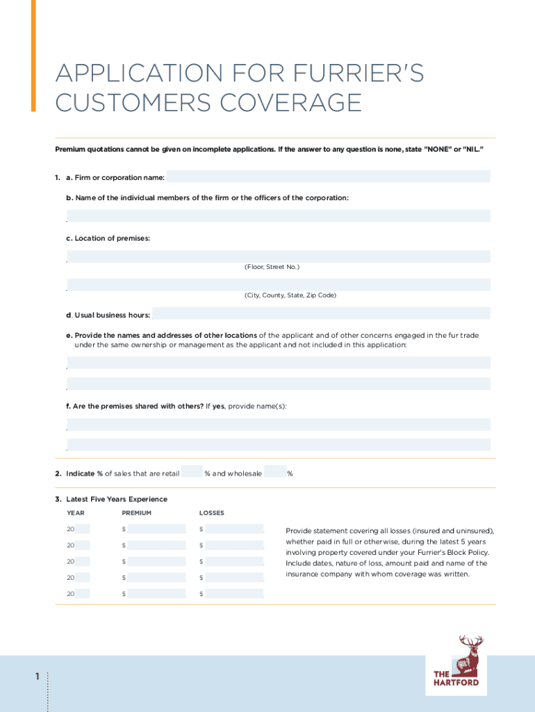 APPLICATION FOR FURRIER\'S CUSTOMERS COVERAGE Premium quotations cannot be given on incomplete applications. If the answer to any question is none, state \” NONE\” or \” NIL.\” 1. a. Firm