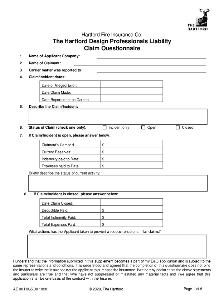 Hartford Fire Insurance Co. The Hartford Design Professionals Liability Claim Questionnaire 1. Name of Applicant Company:2. Name of Claimant:3. Carrier matter was reported to:4. Claim/Incident dates: