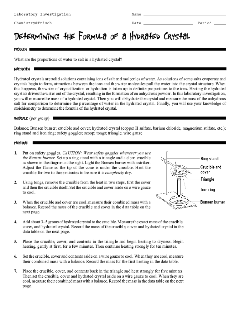 Laboratory Investigational ___Chemistry@FrischDate ___Period ___Determining the Formula of a Hydrated Crystal PROBLEM What are the proportions of water to salt in a hydrated crystal? INTRODUCTIONHydrated