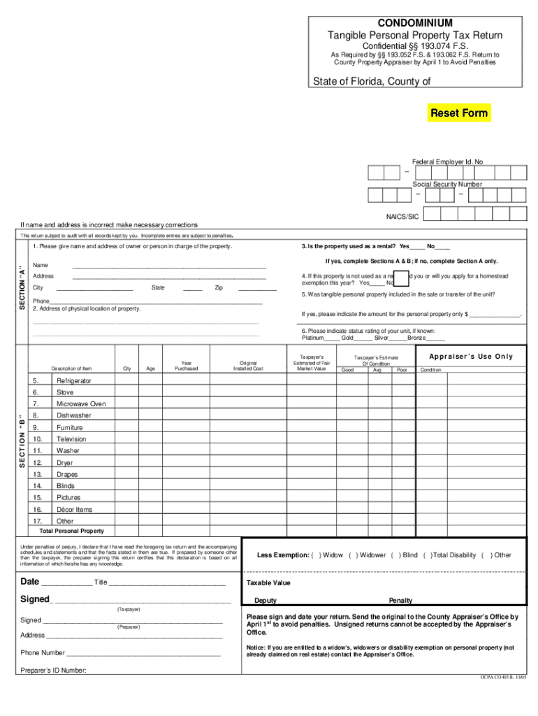 CONDOMINIUM Tangible Personal Property Tax Return Confidential 193.074 F.S. As Required by 193.052 F.S. & 193.062 F.S. Return to County Property Appraiser by April 1 to Avoid PenaltiesState of Florida,