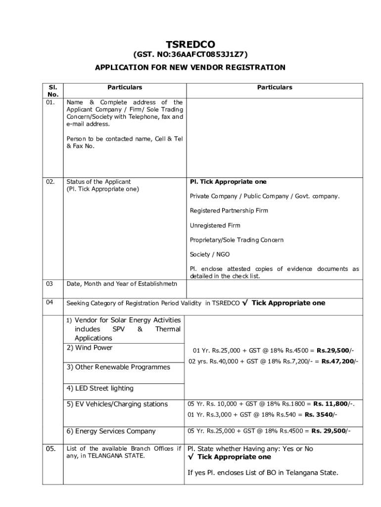 TORPEDO(GST. NO:36AAFCT0853J1Z7) APPLICATION FOR NEW VENDOR REGISTRATION SL. No. 01. ParticularsParticularsName & Complete address of the Applicant Company / Firm/ Sole Trading Concern/Society with