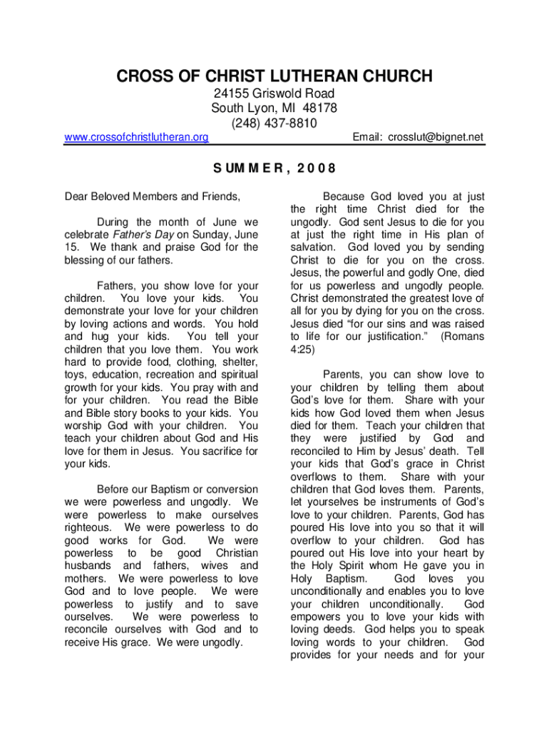 CROSS OF CHRIST LUTHERAN CHURCH 24155 Griswold Road South Lyon, MI 48178 (248) 4378810 www.crossofchristlutheran.orgEmail: crosslut@bignet.netS UM M E R, 2 0 0 8 Dear Beloved Members and Friends,