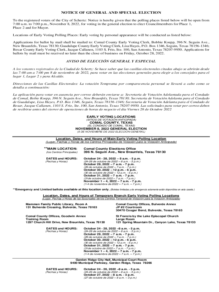 NOTICE OF GENERAL AND SPECIAL ELECTION To the registered voters of the City of Sc hertz: Notice is hereby given that the polling places listed below will be open from 7:00 a.m. to 7:00 p.m., November