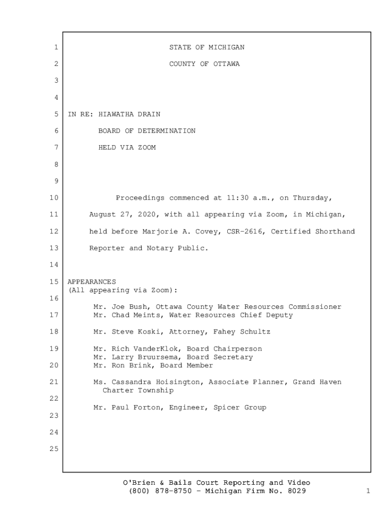 1 STATE OF MICHIGAN 2 COUNTY OF OTTAWA 3 4 5 IN RE: HIAWATHA DRAIN 6 BOARD OF DETERMINATION 7 HELD VIA ZOOM 8 9 10 Proceedings commenced at 11:30 a.m., on Thursday, 11 August 27, 2020, with all appearing