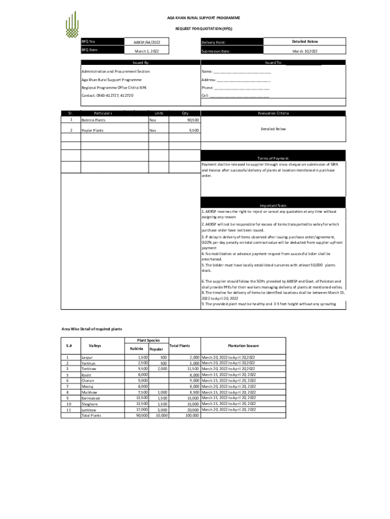 RFQ No:AK RSP/64/2022Delivery Point:Detailed Below Date:March 1, 2022Submission Date:March 10,2022Issued By:Issued To:Administration and