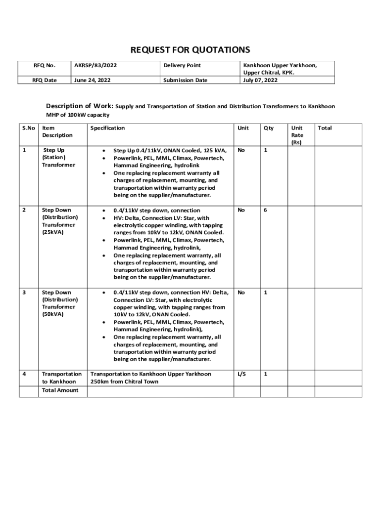 REQUEST FOR QUOTATIONS RFQ No.AKRSP/83/2022Delivery Point Date June 24, 2022Submission DateKankhoon Upper Cartoon, Upper Chiral, PKK. July 07, 2022Description of Work: Supply and Transportation of