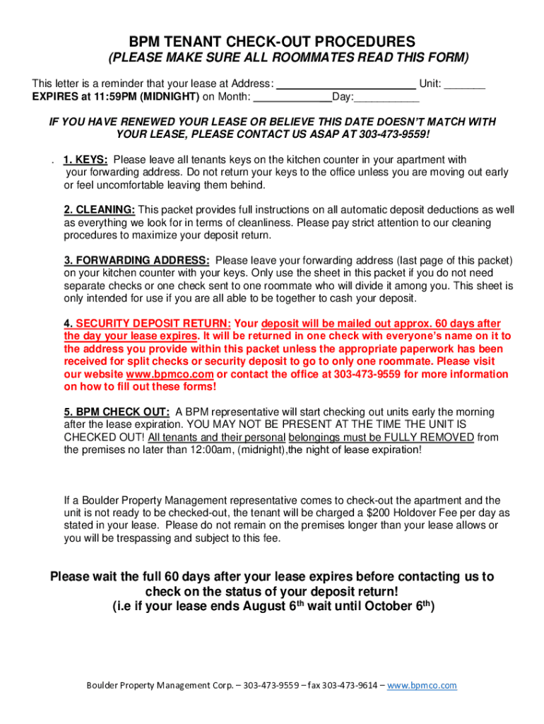 BPM TENANT CHECKOUT PROCEDURES (PLEASE MAKE SURE ALL ROOMMATES READ THIS FORM) This letter is a reminder that your lease at Address: EXPIRES at 11:59PM (MIDNIGHT) on Month:Unit: ___ __Day:___IF YOU