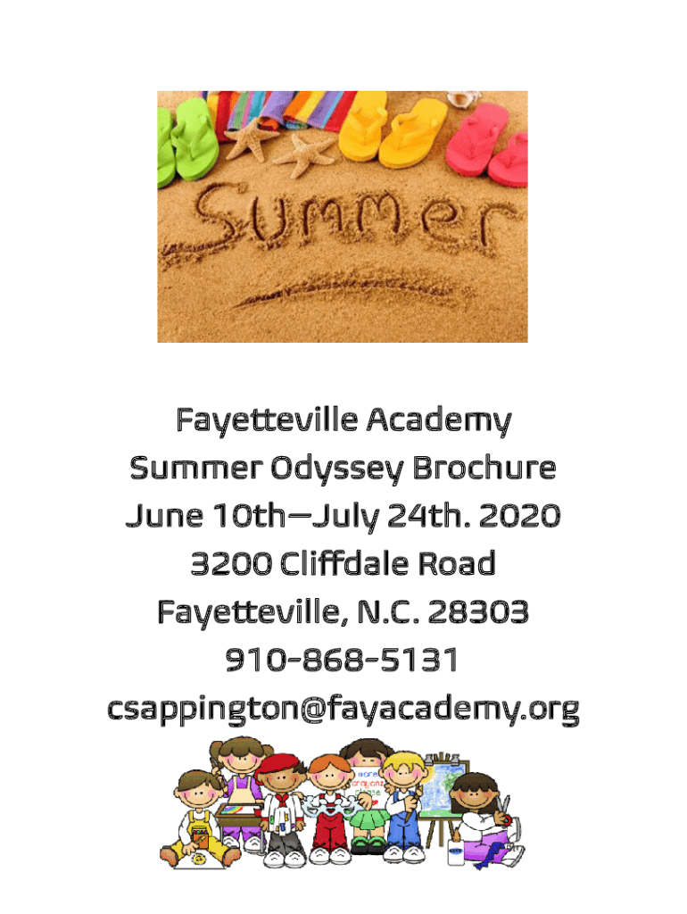 Fayetteville Academy Summer Odyssey Brochure June 10thJuly 24th. 2020 3200 Cliff dale Road Fayetteville, N.C. 28303 9108685131 csappington@fayacademy.orgGeneral Information REGISTRATION: Students