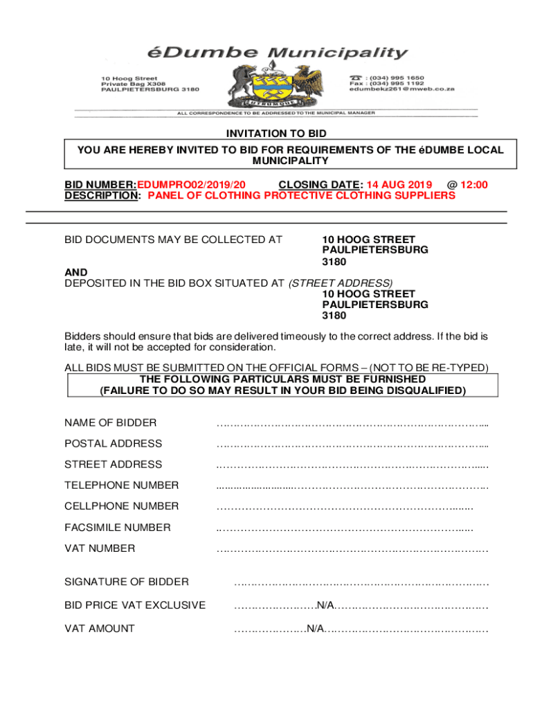 INVITATION TO BID YOU ARE HEREBY INVITED TO BID FOR REQUIREMENTS OF THE DUMB LOCAL MUNICIPALITY BID NUMBER:EDUMPRO02/2019/20 CLOSING DATE: 14 AUG 2019 @ 12:00 DESCRIPTION: PANEL OF CLOTHING PROTECTIVE