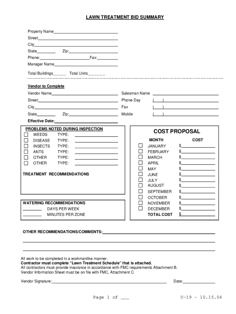 LAWN TREATMENT BID SUMMARY Property Name Street City State:Phone:Fax:Manager Name Total Buildings___ Total Units___ Vendor to Complete Vendor NameSalesman NameStreetPhone Day()City()Mobile()State:Effective