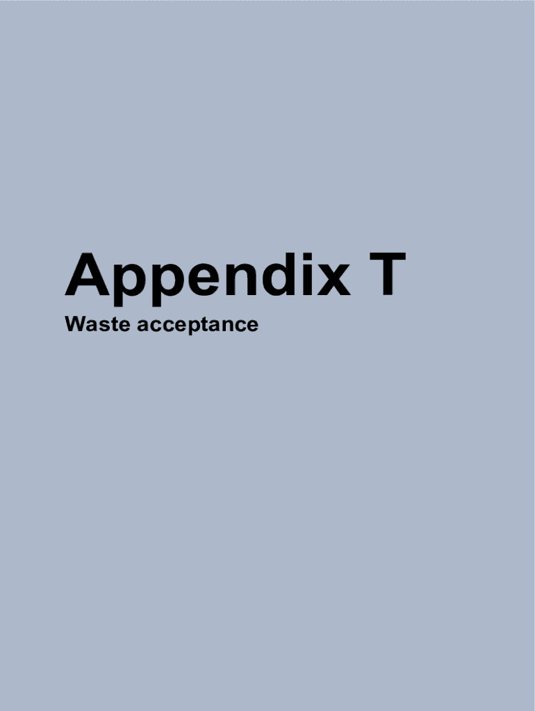 Appendix T Waste acceptanceA1Sandy Ridge Facility Waste Acceptance Policy (Tells, 2016) (see Appendix A(A24))A2Sandy Ridge Facility Waste Acceptance Criteria (Tells, 2016) (see Appendix A(A24))A3Sandy
