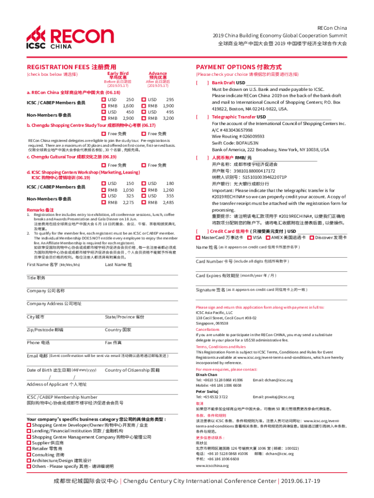 RECon China2019 China Building Economy Global Cooperation Summit 2019 REGISTRATION FEES (check box below)Early Bird Before (2019.05.17)a. RECon China (06.18) CSC / CABER Members Nonmembers USDRMBUSDRMBAdvance